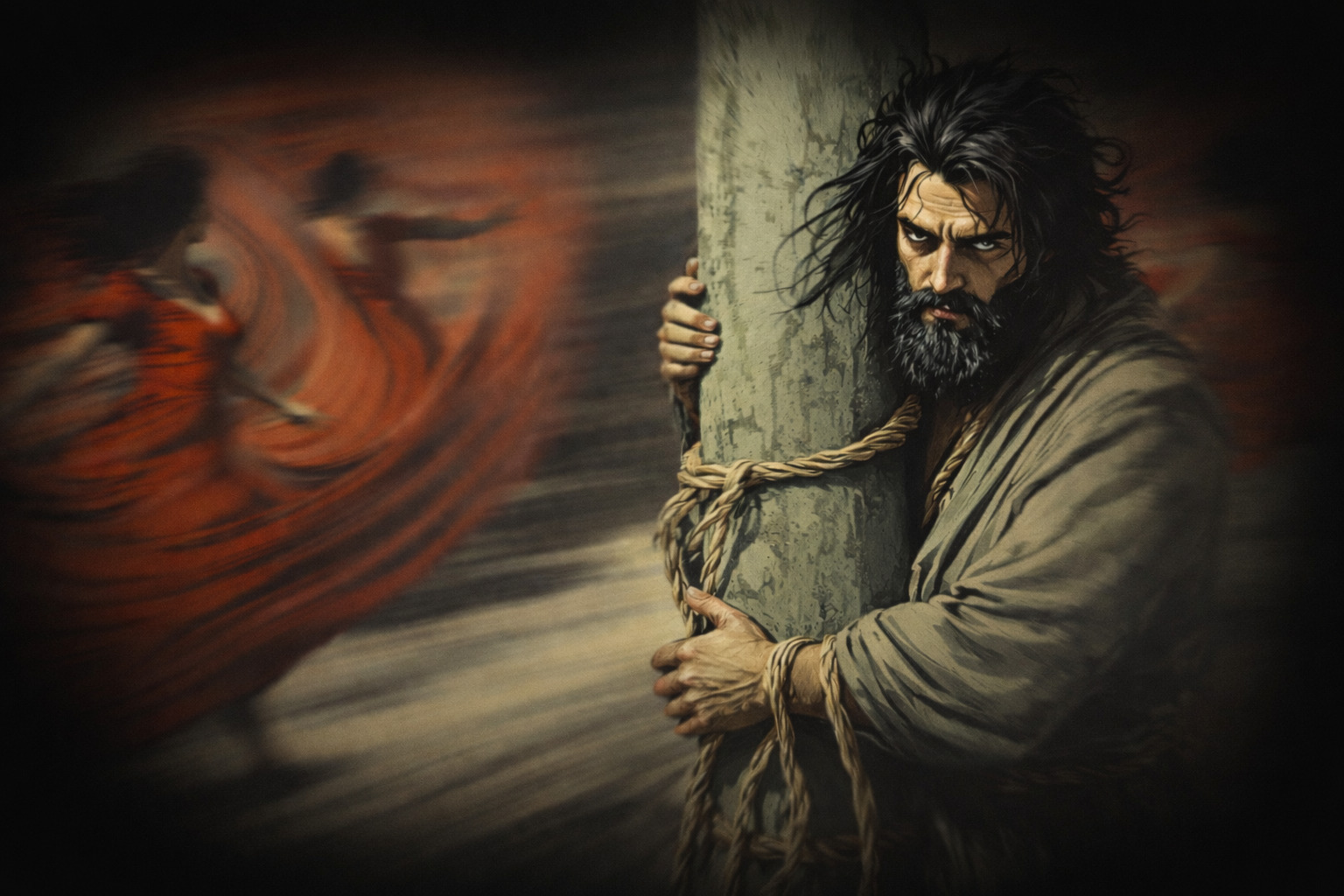 Recognizing that the tarantula has taken revenge, Zarathustra fears that his soul might now begin to spin with vengeance. To prevent himself from succumbing to this cycle, he implores his friends to bind him to a pillar, expressing a preference to become a pillar saint rather than a spinning whirlwind of vengeance, or a ‘Tarantella dancer’.